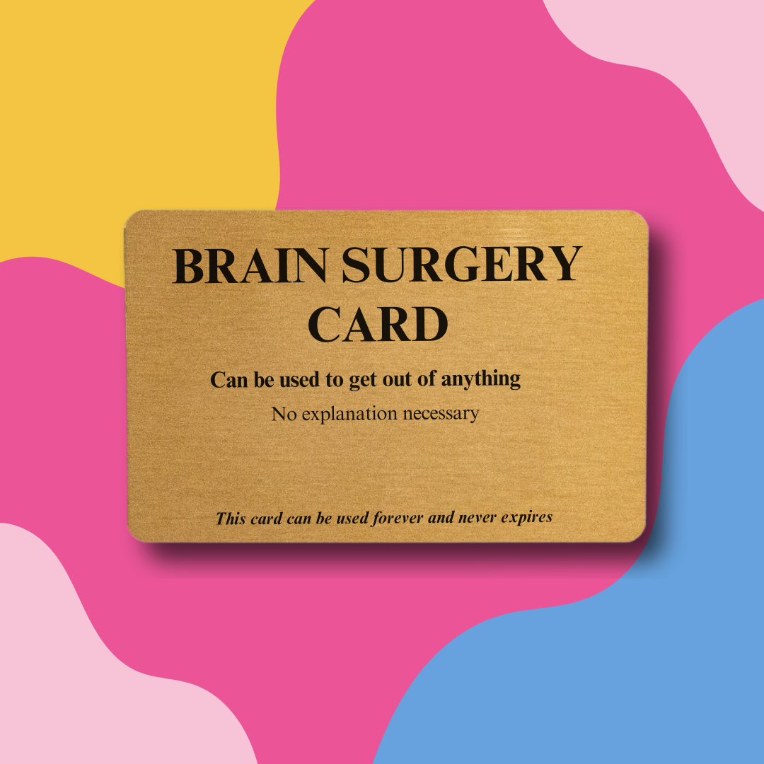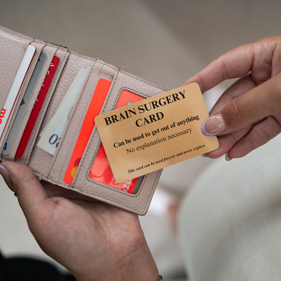 Brain Surgery Card – The Perfect Tongue-in-Cheek Gift. Funny gold wallet card, cheeky humour gift and quirky keepsake for yourself or friend.