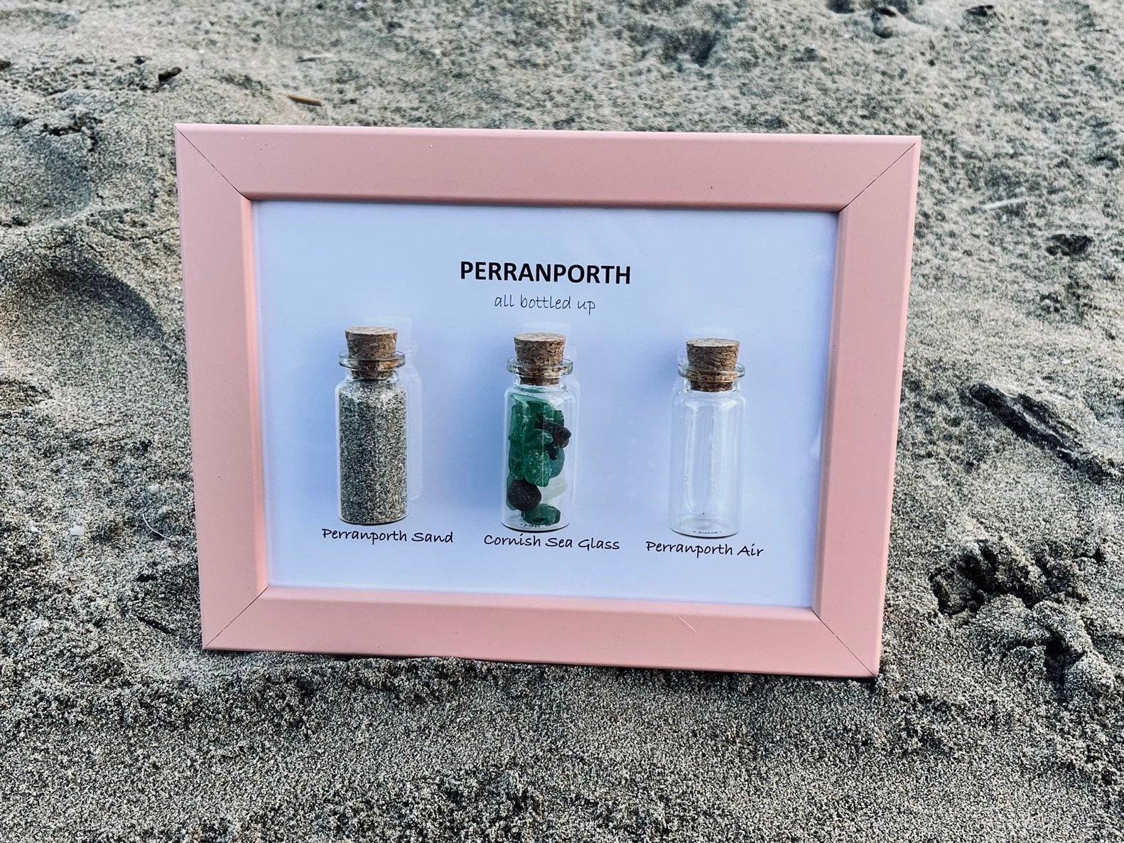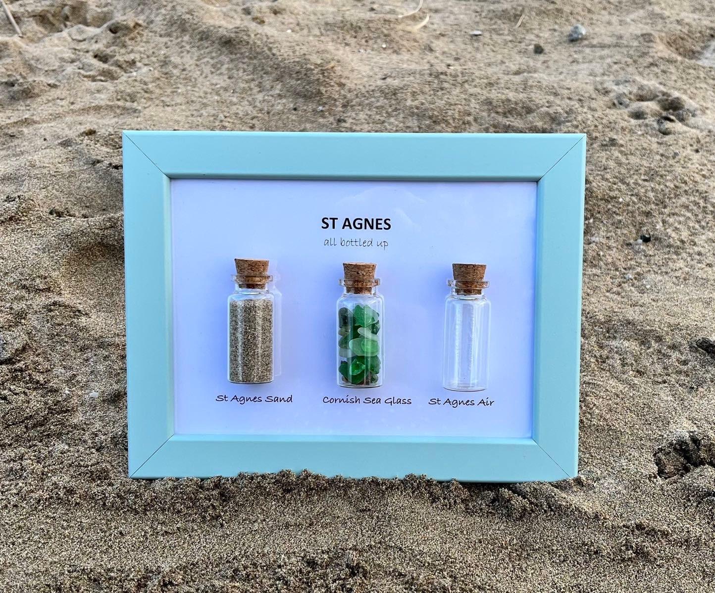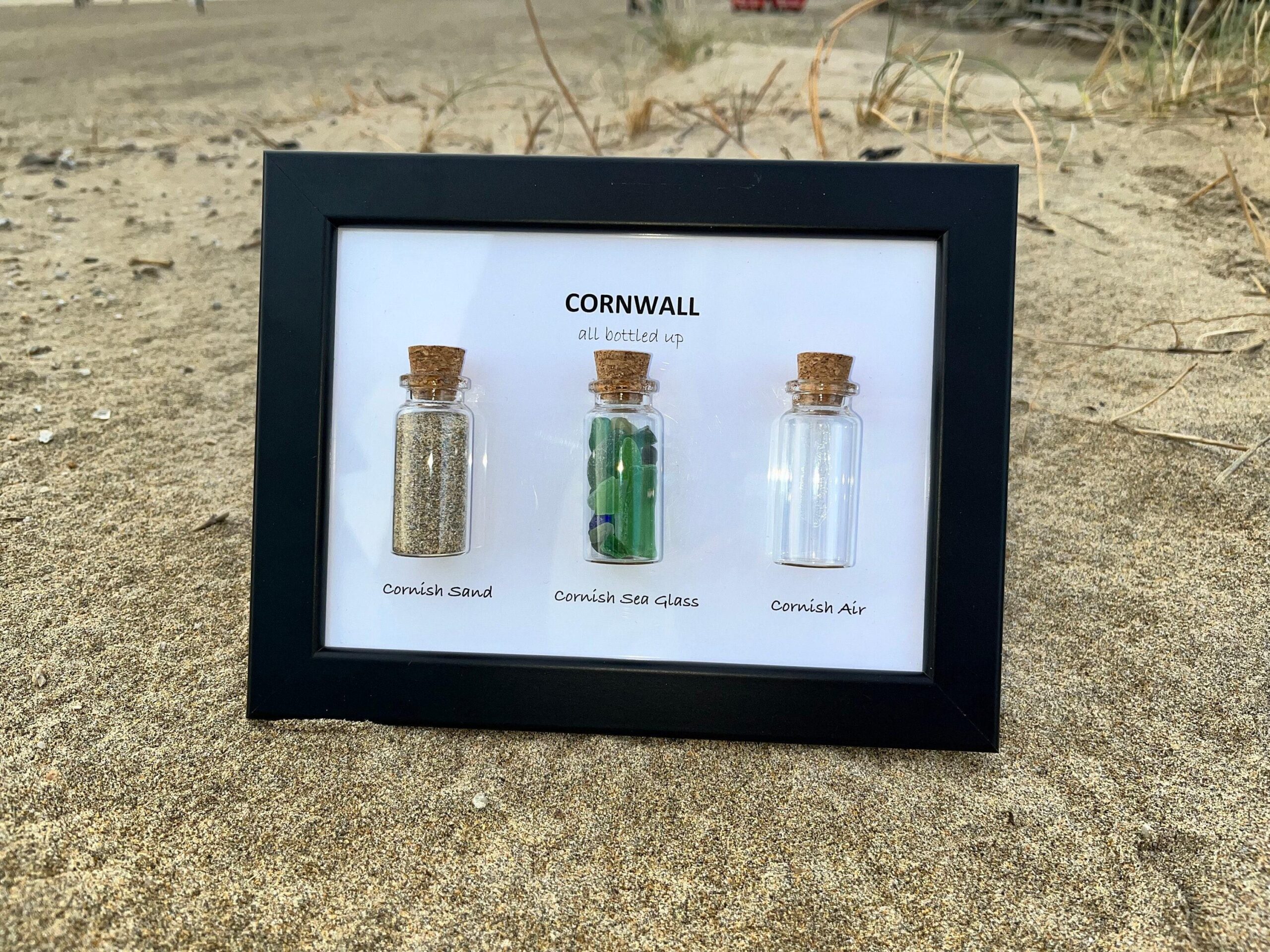 Ethically sourced sand and air collected from each named beach (yes really!) and sea glass from variety of Cornish beaches.