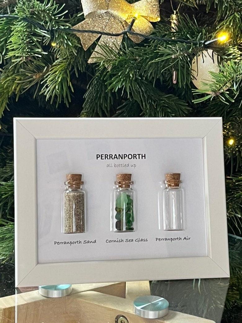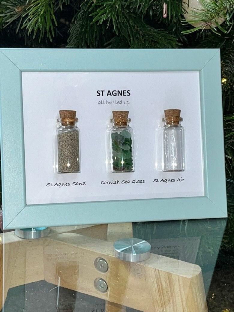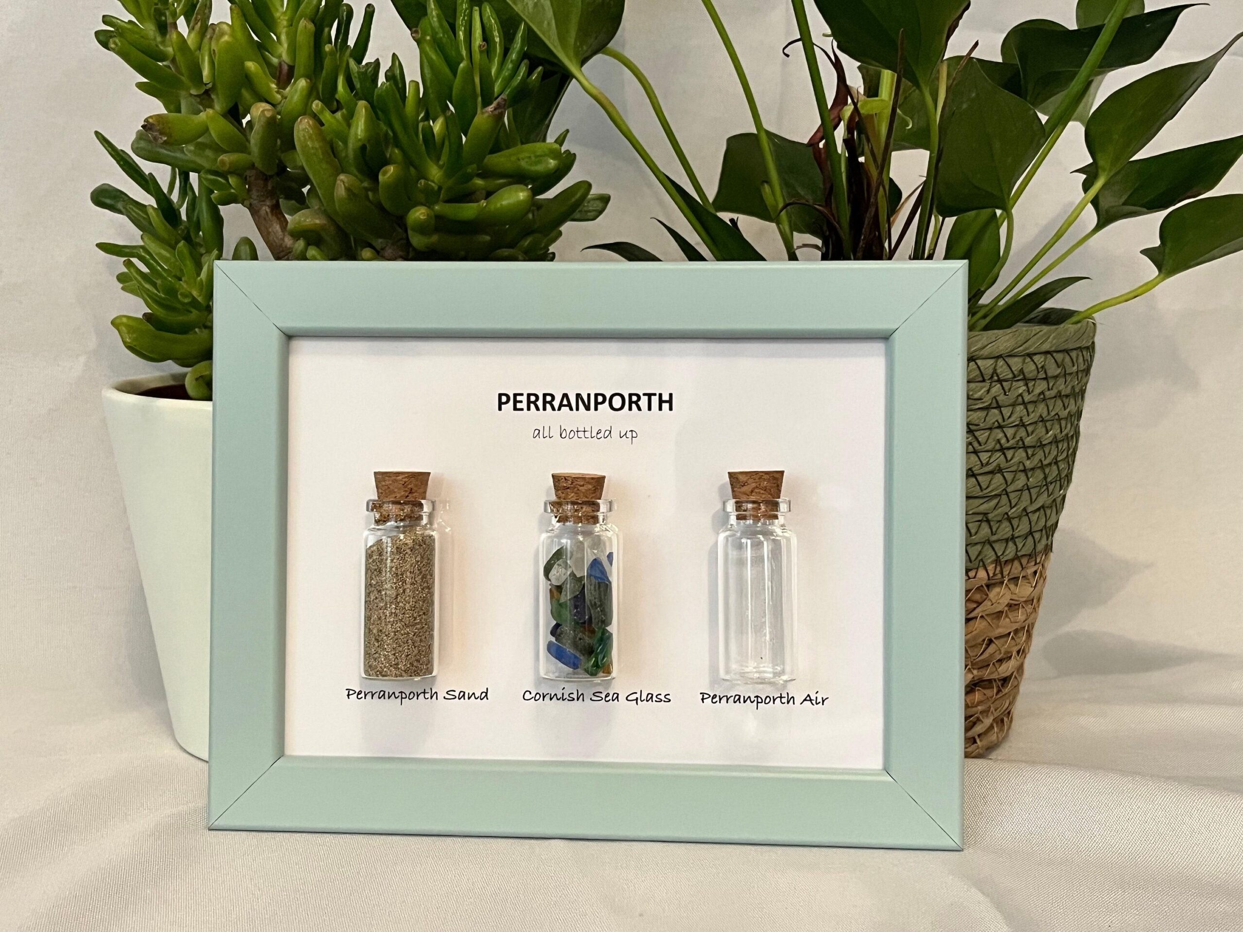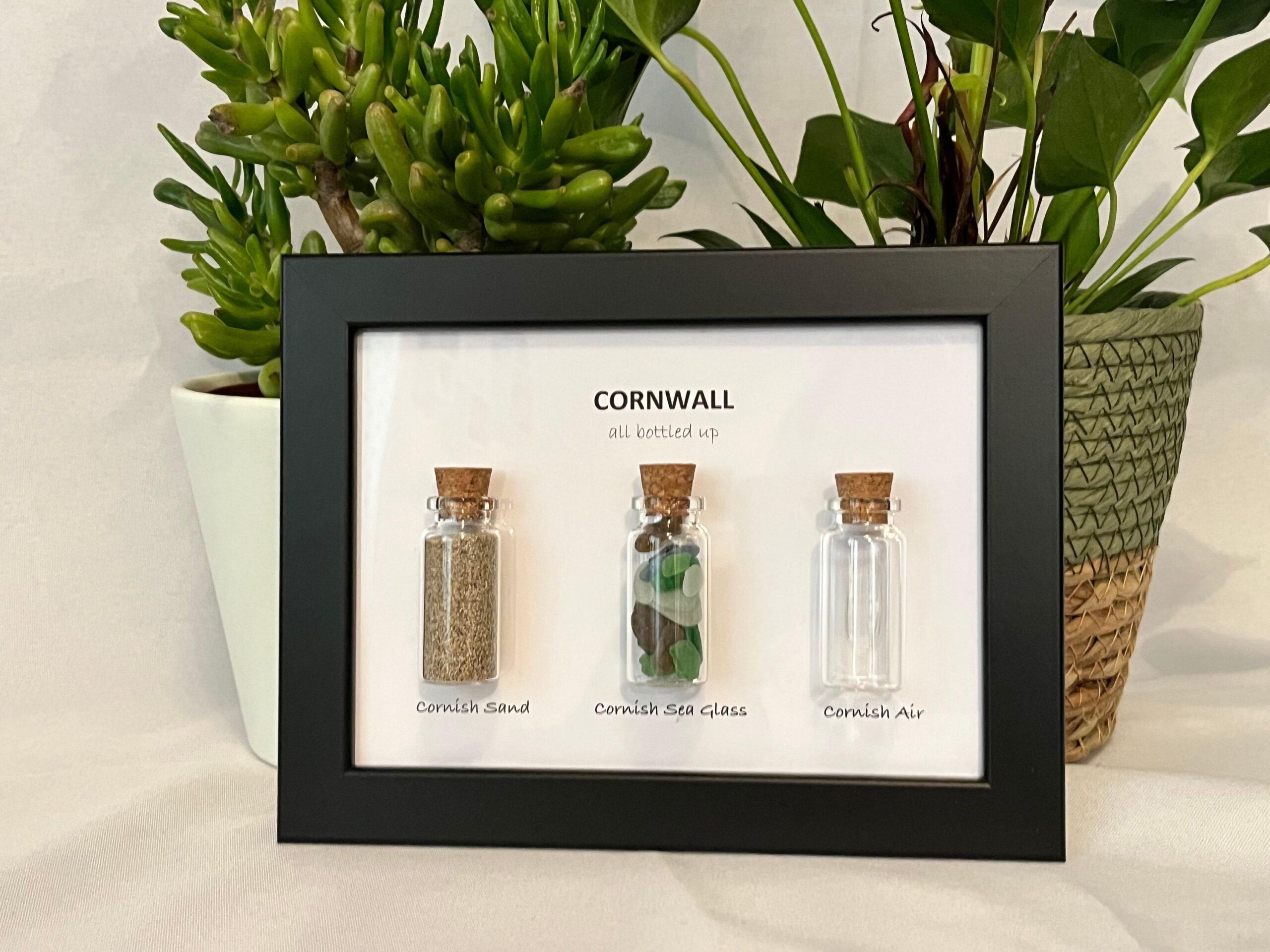 Ethically sourced sand and air collected from each named beach (yes really!) and sea glass from variety of Cornish beaches.