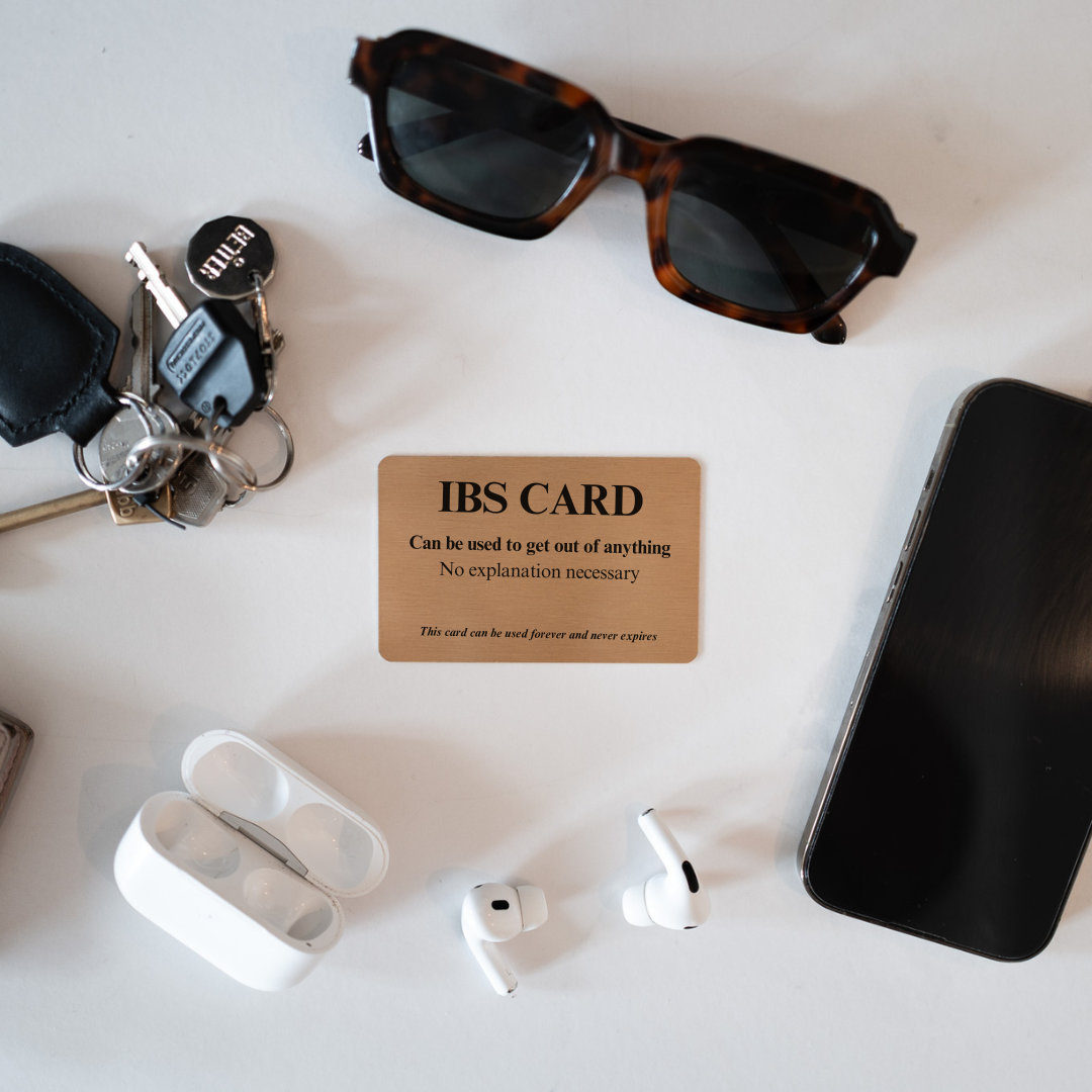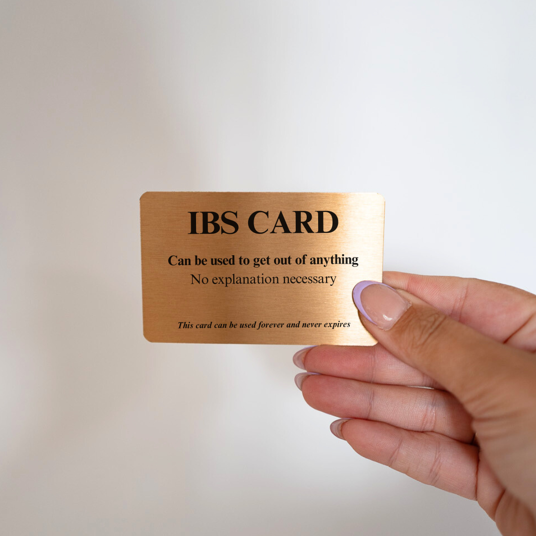 IBS Card – The Perfect Tongue-in-Cheek Gift. Funny gold wallet card, cheeky humour gift and quirky keepsake for yourself or friend.