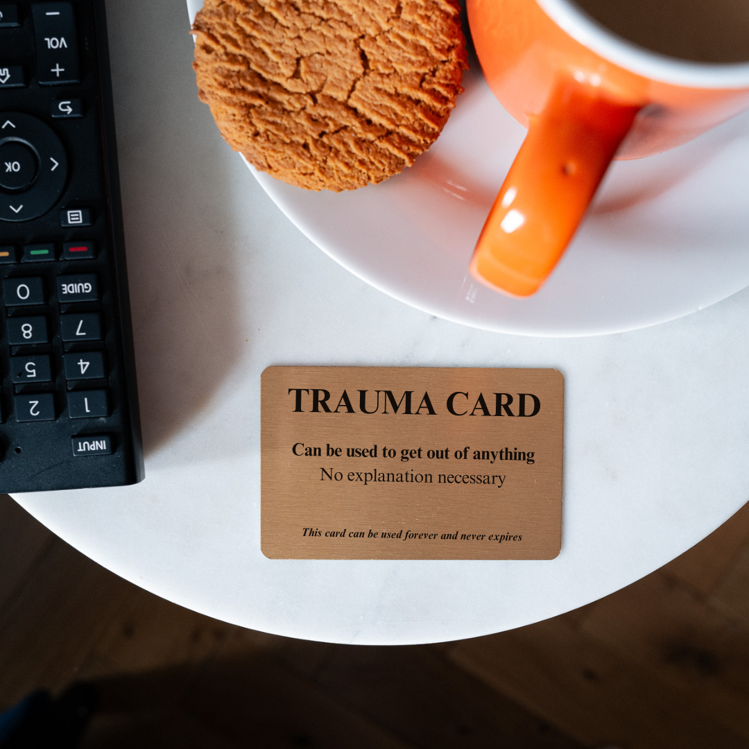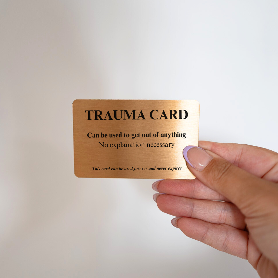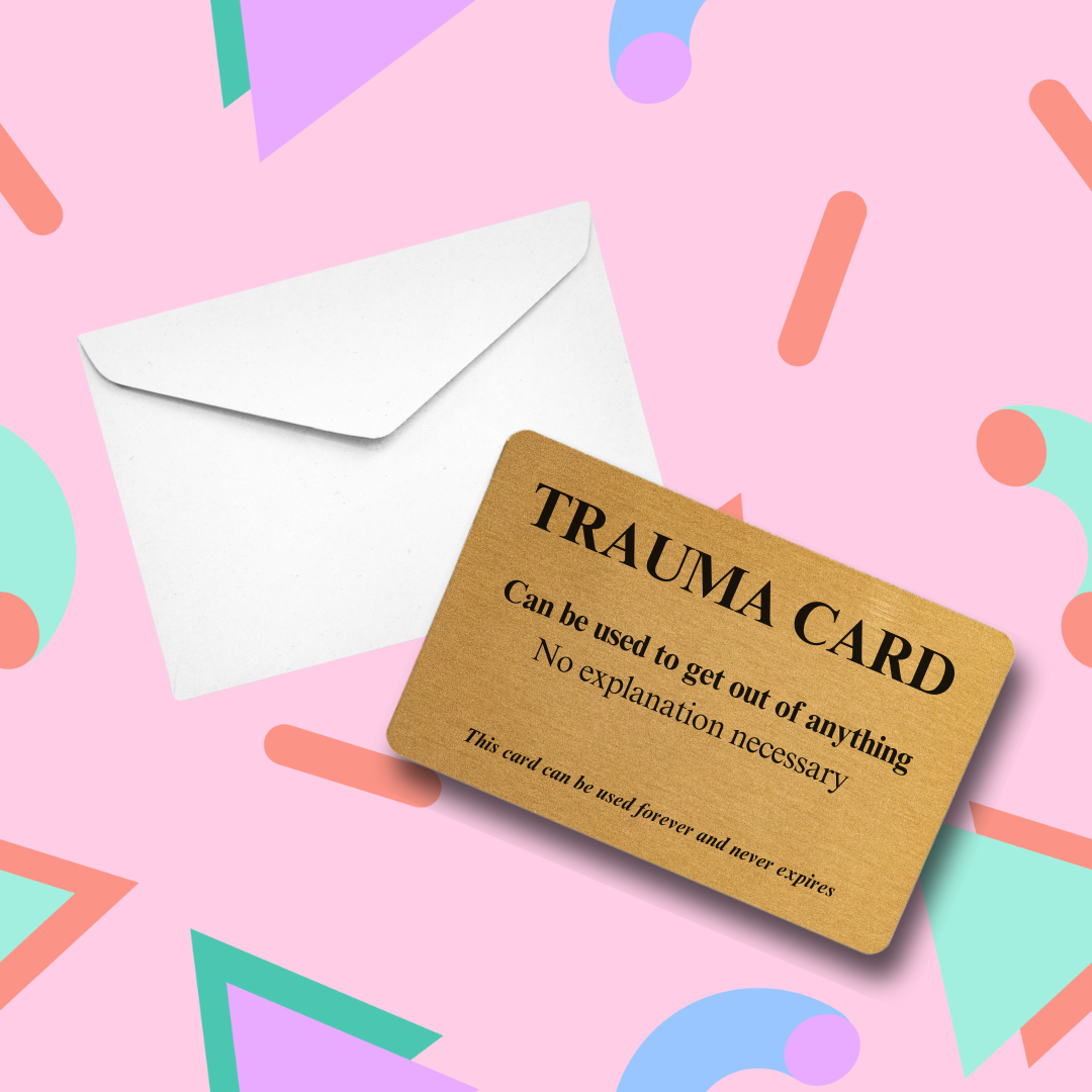 Trauma Card – The Perfect Tongue-in-Cheek Gift. Funny gold wallet card, cheeky humour gift and quirky keepsake for yourself or friend.